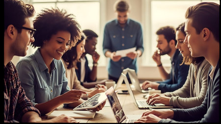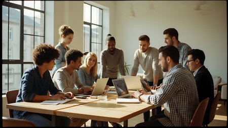 A team leader guides a group of people sitting around a table, each focused on their laptops, A determined leader leading a team meeting with enthusiasm and authority