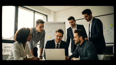 A diverse team collaborates around a laptop in an office. They discuss strategies, share insights, and demonstrate teamwork in a professional environment.