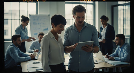 Business people team colleagues in modern office. Man and woman meeting conference and presentation in room.