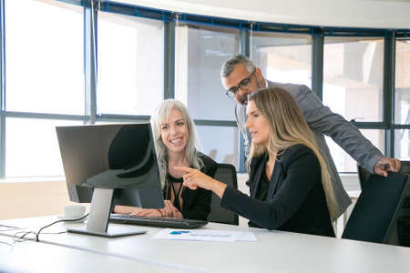 Successful business team watching content on computer monitor together, discussing project, sitting at workplace and pointing at display. Business communication or teamwork concept