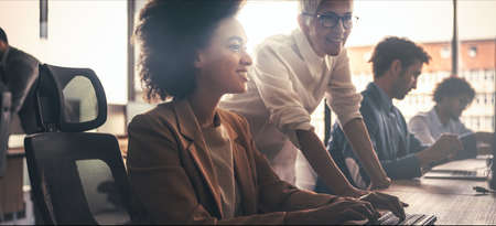 African american businesswoman working on computer at modern office. Multiethnic startup business team on meeting.