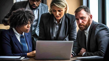 A diverse business team collaborates around a laptop in a modern meeting room. Focused discussions highlight teamwork and strategy among professionals.