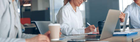 Beautiful business people are using gadgets, talking and smiling during the conference in office
