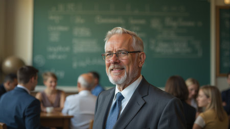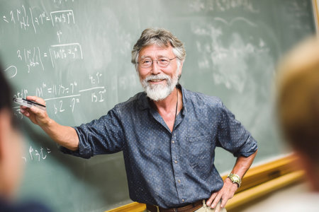 A senior educator pointing at a blackboard, filled with knowledge and experience, ready to impart wisdom to the next generation