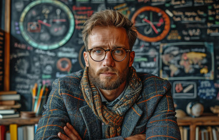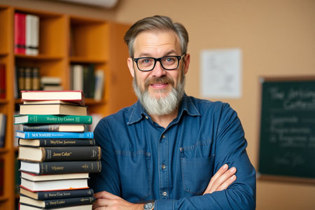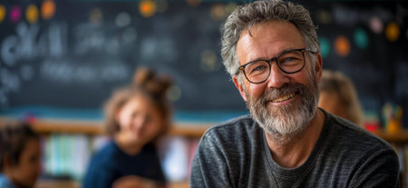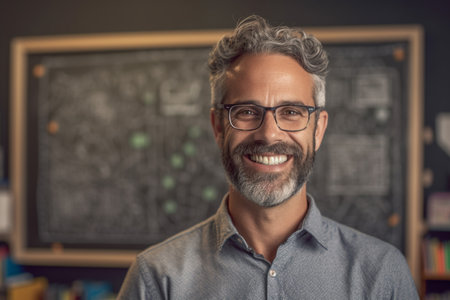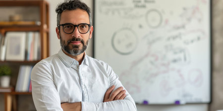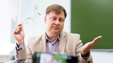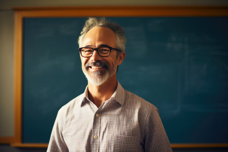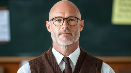 Middle-aged teacher with eyeglasses in the classroom setting, looking at the camera and demonstrating a professional teaching approach