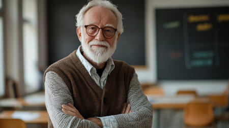 portrait of bearded teacher in eyeglasses standing with crossed arms in classroom