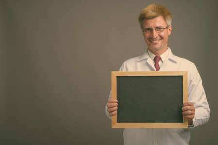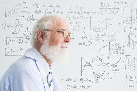 Portrait of smiling senior scientist against the whiteboard with formulas