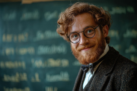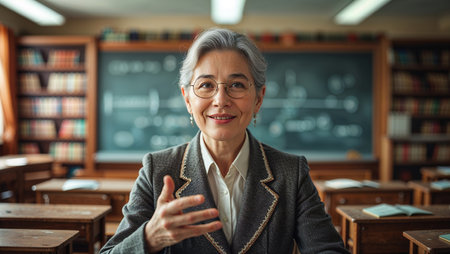 Engaging teacher conducts a lesson in a classic classroom setting with books and chalkboard