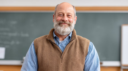 A warm and friendly male teacher stands confidently in a classroom, wearing a brown sweater vest and a blue shirt, embodying the spirit of education and mentorship.