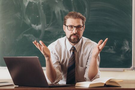 Portrait of confident male teacher in classroom. Young male teacher with laptop in class sits at the table the blackboard in the classroom. Teacher smiling at classroom at the elementary school