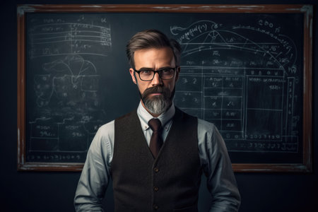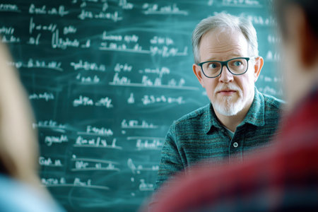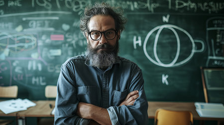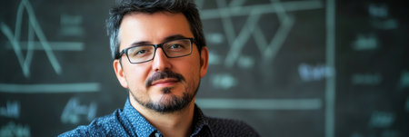 Experienced high school teacher in front of a blackboard, representing mathematics education.