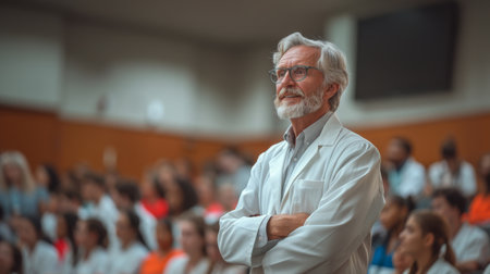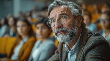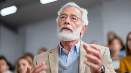 Portrait of elderly male professor speaking passionately during a university lecture, surrounded by attentive students in a classroom setting.