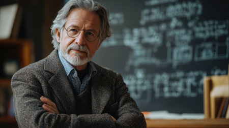 shot of a mature professor standing with his arms crossed in front of the blackboard