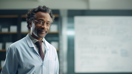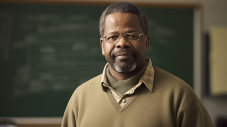Teacher Male African-American Middle-aged Standing in front of a classroom with a chalkboard in Indoor classroom. Generative AI AIG22.