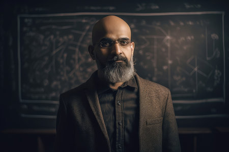 Indian bald physics teacher. Confident bearded teacher with glasses in classroom. Generate ai