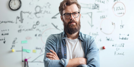 Bearded professional uses pen on whiteboard in modern office, developing creative solutions.