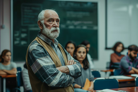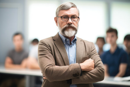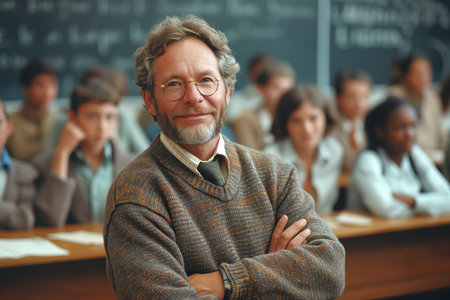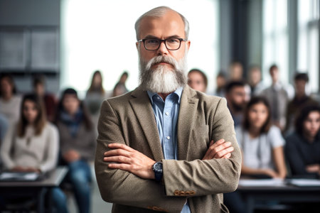 Middle aged male teacher with arms crossed in front of students in a classroom. Generative AI
