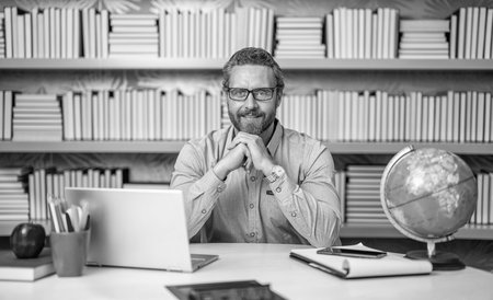 Private lesson. Back to school. Science concept. Mature bearded teacher in classroom. Study with interest. Man mentoring school projects. School subject. Basic education. History and geography