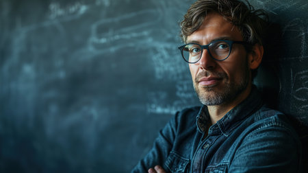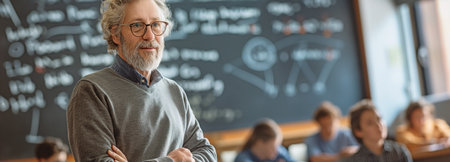 Confident and approachable scene of a male teacher standing before a chalkboard in a well-organized classroom, radiating intelligence and a love for teaching, banner