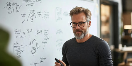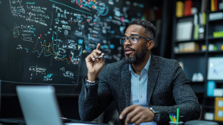 Focused mathematician chalkboard equations well-organized intellectually stimulating