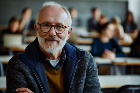 An elderly man sits comfortably in a classroom, exuding wisdom and knowledge.