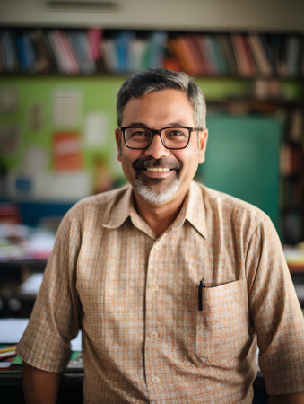 Portrait of Indian male teacher sitting at desk in classroom, wearing eyeglasses