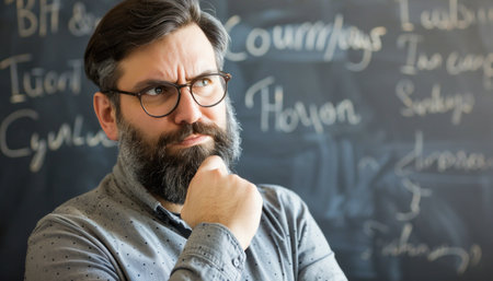 Confident bearded teacher in classroom with copy space for text on blurred background