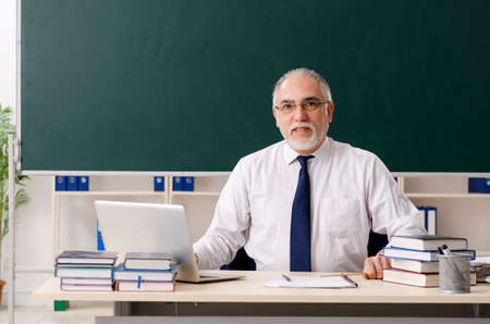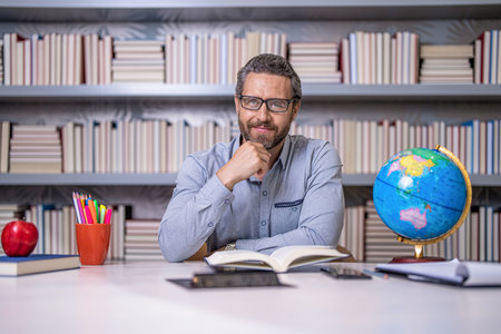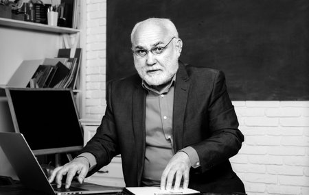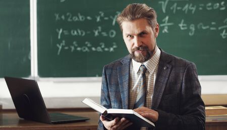 Portrait of mature teacher or tutor professor working at table in college or high school. Senior teacher. Portrait of mature teacher in classroom. Middle aged professor, teacher on blackboard.