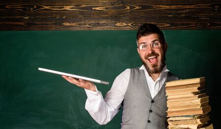 Happy male teacher holds book and laptop. Modern technologies benefit. Paper book against laptop. Online education and learning. Take advantage technologies development. Education and technology.