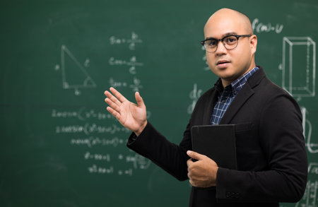 A teacher pointing at a blackboard. University professor with a black book in his hand. Master dressed in an elegant brown suit. Elegant man in a blackboard explaining a topic. High quality photo