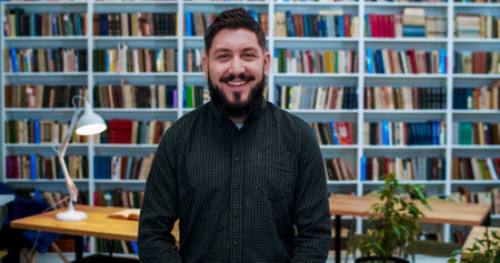 Portrait shot of Caucasian young man with beard standing in library in front of camera and looking surprised. Male cheerful student or bibliotheca worker smiling as having surprise.