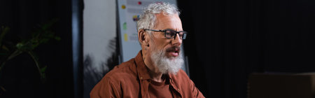 bearded and grey haired businessman in eyeglasses looking away in office, banner