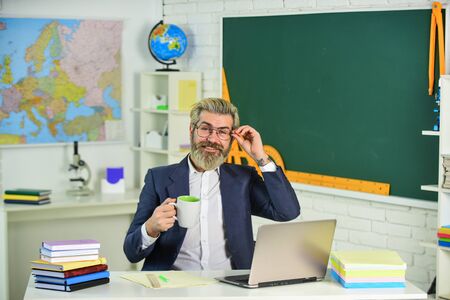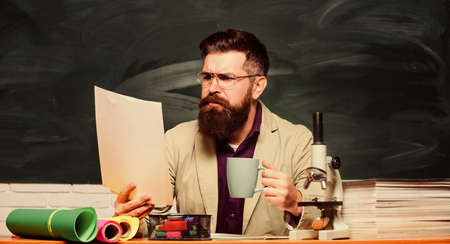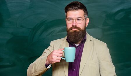 Education and school concept. bearded man hipster drink tea at school. ready for lesson. mature teacher at blackboard. Towards knowledge. good morning coffee. back to school. intelligent look