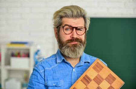 Bearded professor at school lesson at desks in classroom. Education. Chalkboard copy space. Friendly teacher in classroom near blackboard desk.