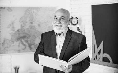 happy senior lecturer make notes. teacher of geography. classroom with map and blackboard. back to school. math education in school. bearded man give marks. write notes in book