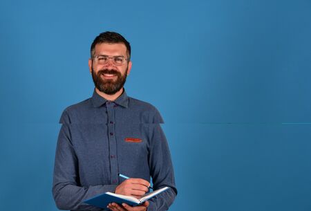 Textbook in blue color in guys hands on blue background. Knowledge and lesson concept. Man with beard and book. Professor with serious face. Teacher wears glasses and holds organizer and marker