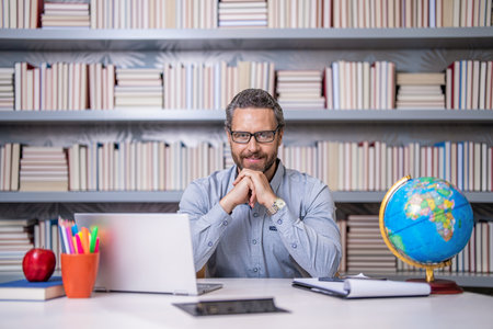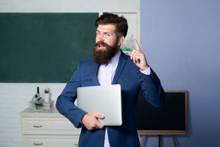 Distance learning. Your application is valid. School project. Back to school. Knowledge day. Man work school teacher sit in classroom. Handsome hipster mature smart educator. Use laptop and internet