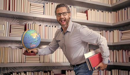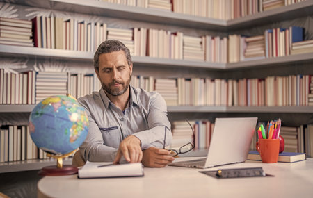 Private lesson. Back to school. Science concept. Mature bearded teacher in classroom. Study with interest. Man mentoring school projects. School subject. Basic education. History and geography