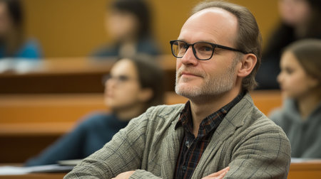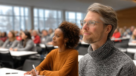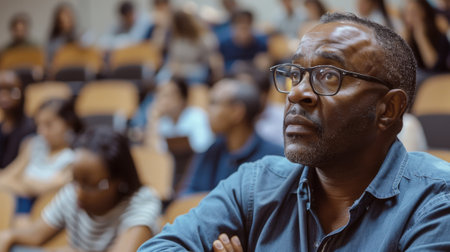 A focused mature student wearing glasses attentively listens to a university lecture in a crowded classroom, reflecting lifelong learning and dedication.