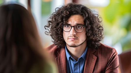 A focused young man in glasses attentively listens and ponders during a business conference, absorbing valuable insights and knowledge.