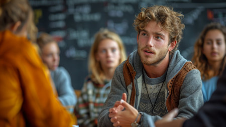 Professor teacher man answer and explain during lesson with diversity students group in classroom. Generative AI