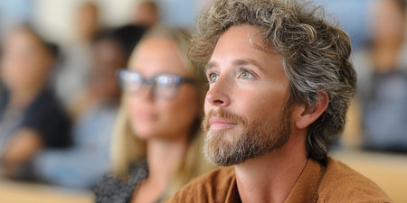 Middle age man listening speech in lecture hall, conference, learning, sharing knowledge concept