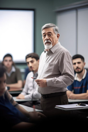 An elderly professor with a white beard and curly hair delivers a lecture to attentive students in a classroom setting.