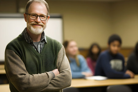 Middle aged male teacher with arms crossed in front of students in a classroom. Generative AI