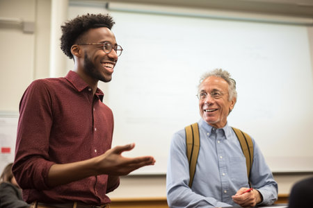 Professor teacher man answer and explain during lesson with diversity students group in classroom. Generative AI