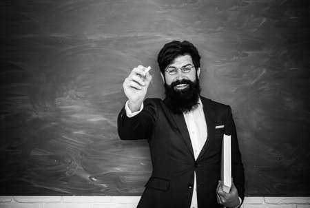 Back to school and happy time. Preparing for exam in college. Young bearded teacher near chalkboard in school classroom. Teachers day.