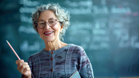 A positive teacher elderly with a pointer in his hand. A gray-haired woman with glasses is smiling and holding a pencil in her hand. Teacher's Day. She is standing in front of the blackboard with a book in her hand.