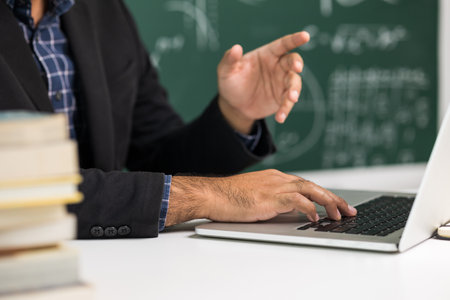 Close up teacher man sitting teaching online video conference live stream by laptop. Teacher teaching mathematics class webinar online for students learning.