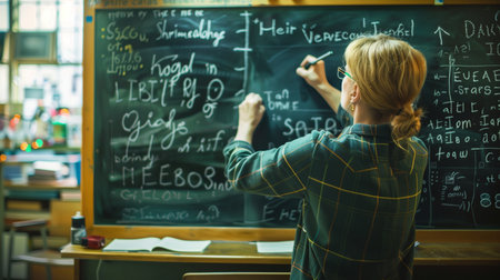 dedicated teacher standing at the chalkboard, writing with chalk while students observe.