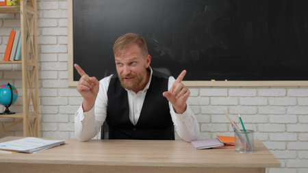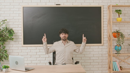 A male teacher sits at a desk in a classroom with a blackboard in the background and points upward with his index fingers. Workspace, copy space.